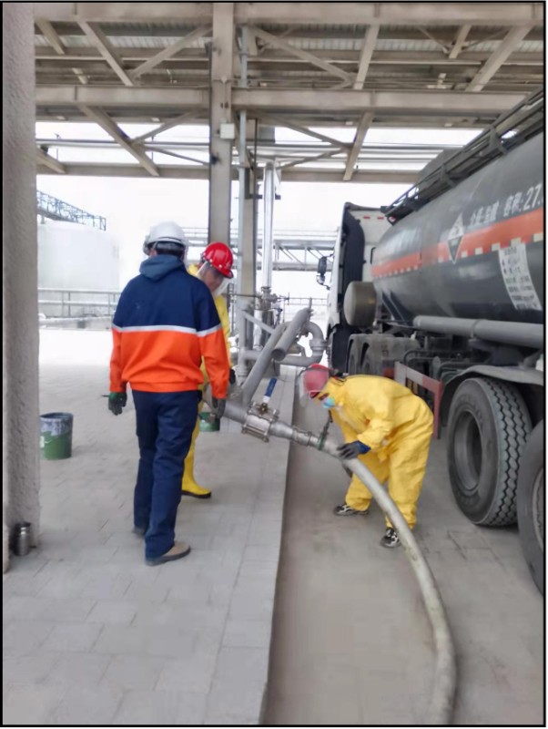 正式作業(yè)前,項(xiàng)目各班組人員對汽車輸送泵、堿液罐區(qū)氣動(dòng)調(diào)節(jié)閥等進(jìn)行檢測試驗(yàn),對工藝流程中法蘭、管道等進(jìn)行周密檢查,多次確認(rèn)。各專業(yè)人員緊密配合,協(xié)同工作,為堿液順利進(jìn)料做好充分準(zhǔn)備工作。隨著裝滿堿液的罐車緩緩駛?cè)胛锪鲌@貨場裝卸棧臺(tái),班組各崗位人員認(rèn)真落實(shí)安全措施,嚴(yán)格按照操作流程進(jìn)行進(jìn)料作業(yè),堿液儲(chǔ)罐順利完成首次進(jìn)料。
