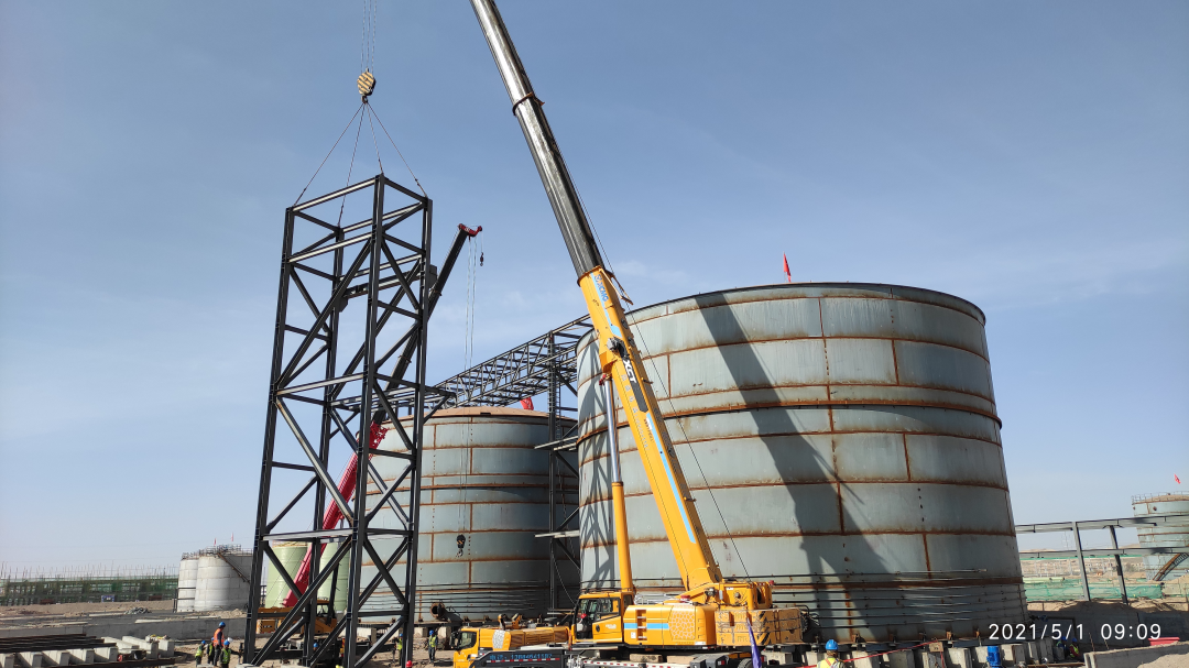 化工商貿(mào):物流園貨場(chǎng)硫酸罐鋼結(jié)構(gòu)吊裝順利完成