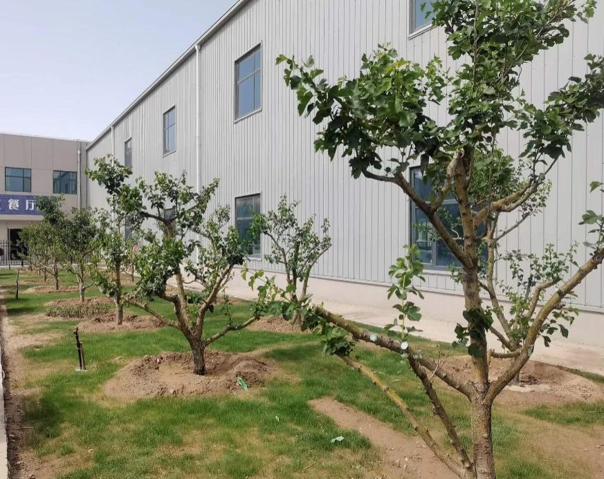 因地制宜,確定綠化方案。公司以“凈化美化環(huán)境,改善區(qū)域小氣候”為綠化主要原則,按功能區(qū)對廠區(qū)空地進(jìn)行不同的綠化布置。在廠區(qū)北門口兩側(cè)種植9棵梧桐樹,象征著栽桐引鳳之意。廠區(qū)主干道路兩側(cè)選用高大闊葉喬木樹種,綠化帶內(nèi)種植草坪,辦公樓兩側(cè)栽植四季玫及常青圓柏冬青球組合,廠前區(qū)栽植山楂樹,廠區(qū)西側(cè)栽植山楂樹、杏樹和梨樹。