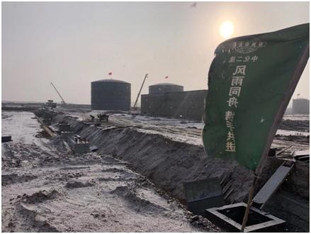 物流園貨場項目現(xiàn)場,各個儲罐、基礎配套設施屹立在風雪之中蔚為壯觀;印有“風雨同舟,攜手共進”的彩旗迎風飄揚;施工現(xiàn)場電焊弧光閃爍點燃著建設者的激情;施工人員手持圖紙,認真指導每一道施工工序。該項目蒸汽管線和地下官網工程建設、硝酸罐安裝工作、廊架鋼結構預制和辦公樓內部裝修工作均按期推進。